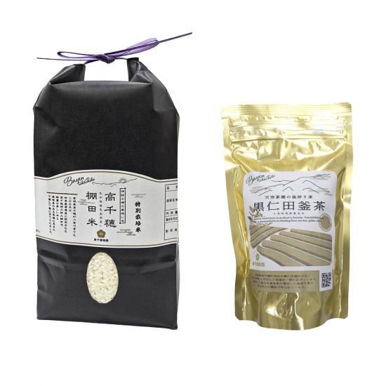 このセットには宮崎県高千穂産特別栽培米ヒノヒカリ1.5kgと黒仁田釜茶80gが含まれており、贈り物や自分へのご褒美に最適です。