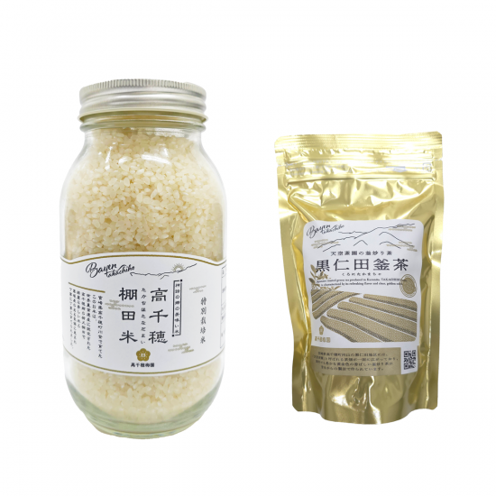 このセットには宮崎県高千穂産特別栽培米ヒノヒカリ5合と黒仁田釜茶80gが含まれており、贈り物や自分へのご褒美に最適です。